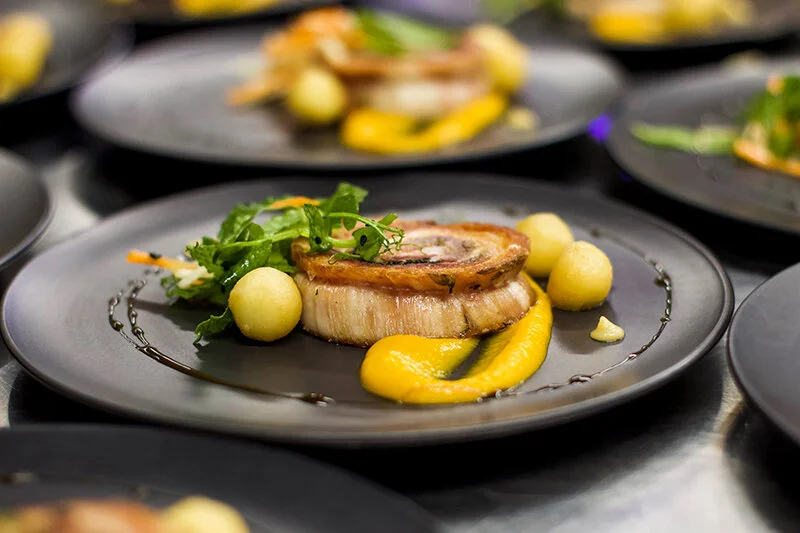 Twice cooked pork belly roulade | cauliflower puree | peach salsa | pickled red onion gel | crackling shard GF