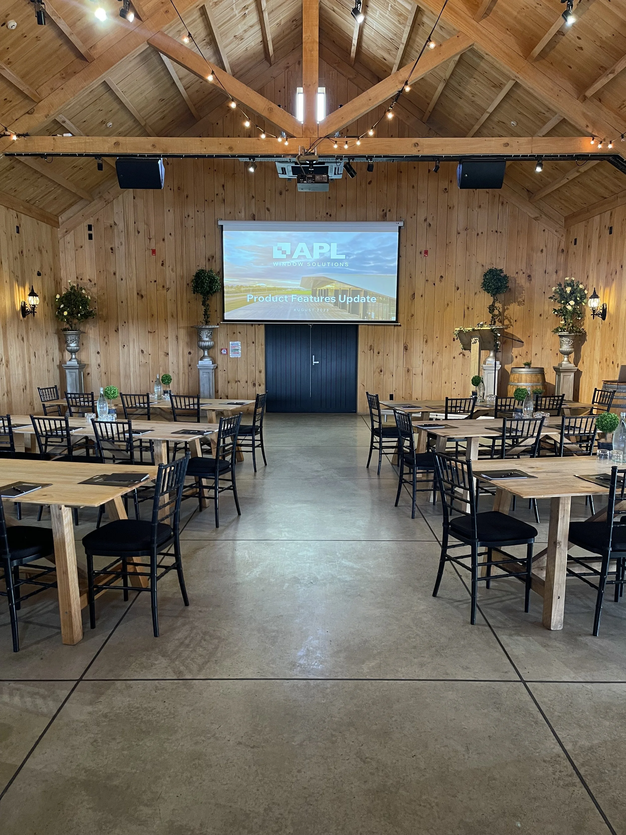 Orlando Country hosts numerous conferences throughout the week in our private function rooms. The main function room features black sliding doors that section you off from the rest of the building, providing added privacy and a quiet atmosphere. The events room is a large, open space with high ceilings supported by trusses, making it perfect for auctions, seminars, presentations, awards evenings or AGMs. It is a spacious area ideal for staging, equipped with extra projector screens, presenter panels, and sound system booths. This room also overlooks the first golf course tee and has large glass doors that open directly onto the driving range and veranda, creating a seamless indoor-outdoor experience.